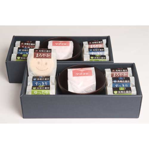 | 詰め合せ内容 | 美噌汁最中 まろやか×4個 ゆったり×4個 すっきり×4個 マゴコロ×2個 の計14個 チャコール椀×2個 |
