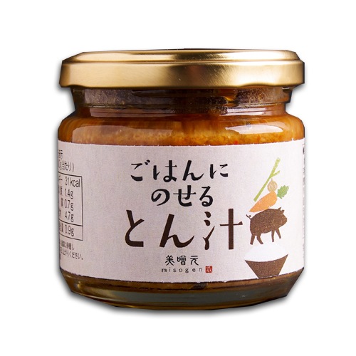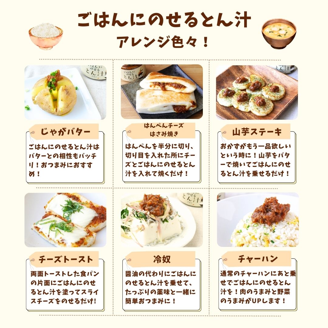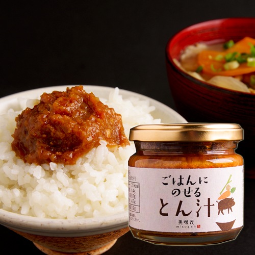 このトロトロ豚汁のレシピを参考に、同じ材料でおかず味噌を作りたいと考え、試行錯誤を重ね完成したのが この「ごはんにのせるとん汁」です。ご飯が進むように生姜と一味の風味を効かせております。 |