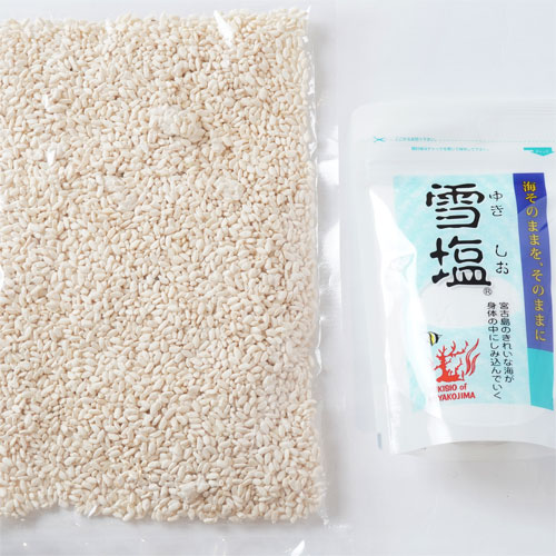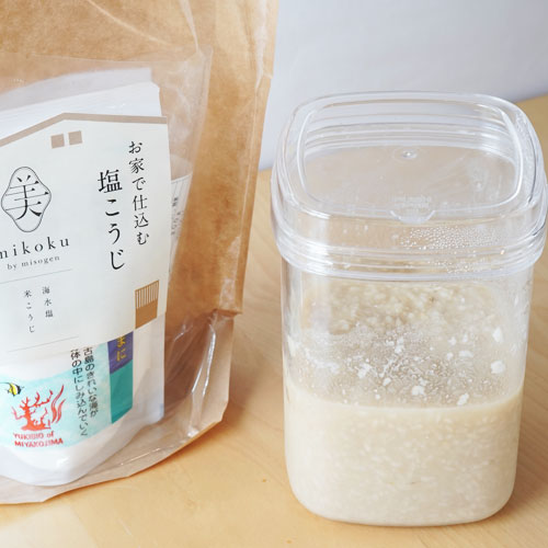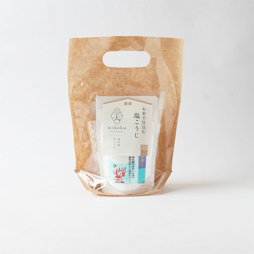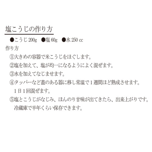 | 詳細説明 | お家で簡単に塩こうじが作れるセットです。 【作り方】 (1)大きめの容器で米こうじをほぐします。 (2)塩を加えて、塩が均一になるようによく混ぜます。 (3)水を加えてなじませます。 (4)タッパーなど蓋のある容器に移し常温で1週間ほど熟成させます。1日1回混ぜます。 (5)塩とこうじがなじみ、ほんのり甘味が出てきたら、出来上がりです。 冷蔵庫で半年くらい保存できます。 |