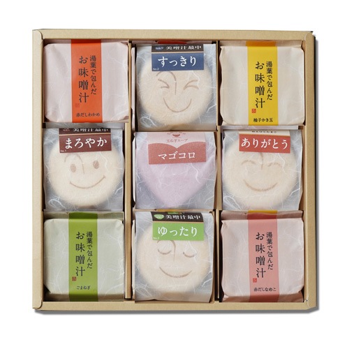 | 詰め合せ内容 | 美噌汁最中 まろやか×1個 ゆったり×1個 すっきり×1個 マゴコロ×1個 ありがとう×1個 湯葉を包んだお味噌汁 赤×1個 黄×1個 緑×1個 桜×1個 の計9個を箱に詰めました。 |