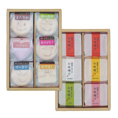 | 詰め合せ内容 | 美噌汁最中 まろやか×1個 ゆったり×1個 すっきり×1個 マゴコロ×1個 ありがとう×1個 美噌元の豚汁×1個 湯葉を包んだお味噌汁 赤×2個 白×1個 緑×1個 黄×1個 桜×1個 の計12個を箱に詰めました。 |